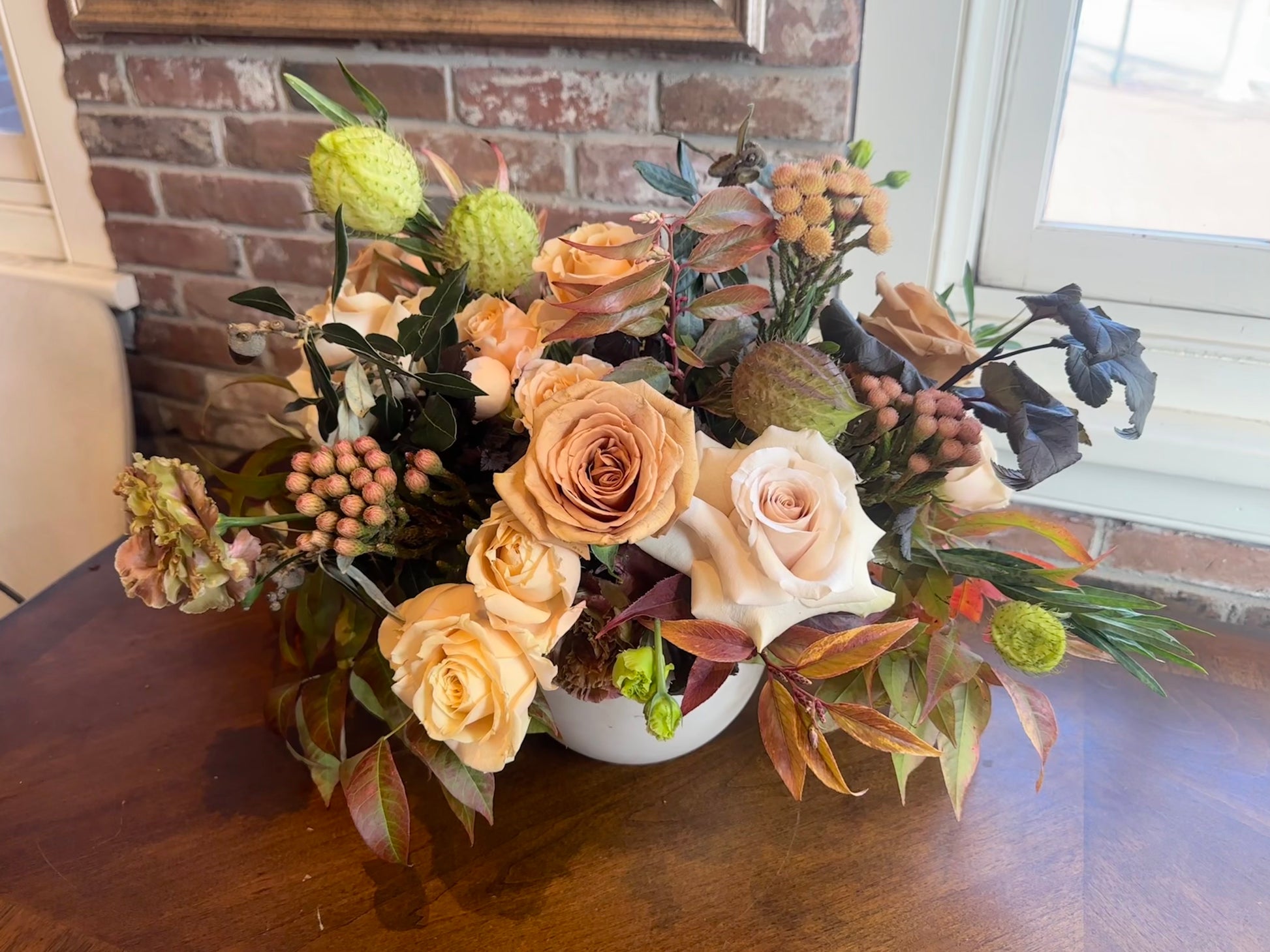 Warm and inviting, this Brown Sugar Latte centerpiece features lush roses in rich, creamy brown tones paired with delicate brunia for texture. The carefully selected foliage adds dimension and movement, creating a sophisticated design that captures the cozy essence of your favorite beverage.
